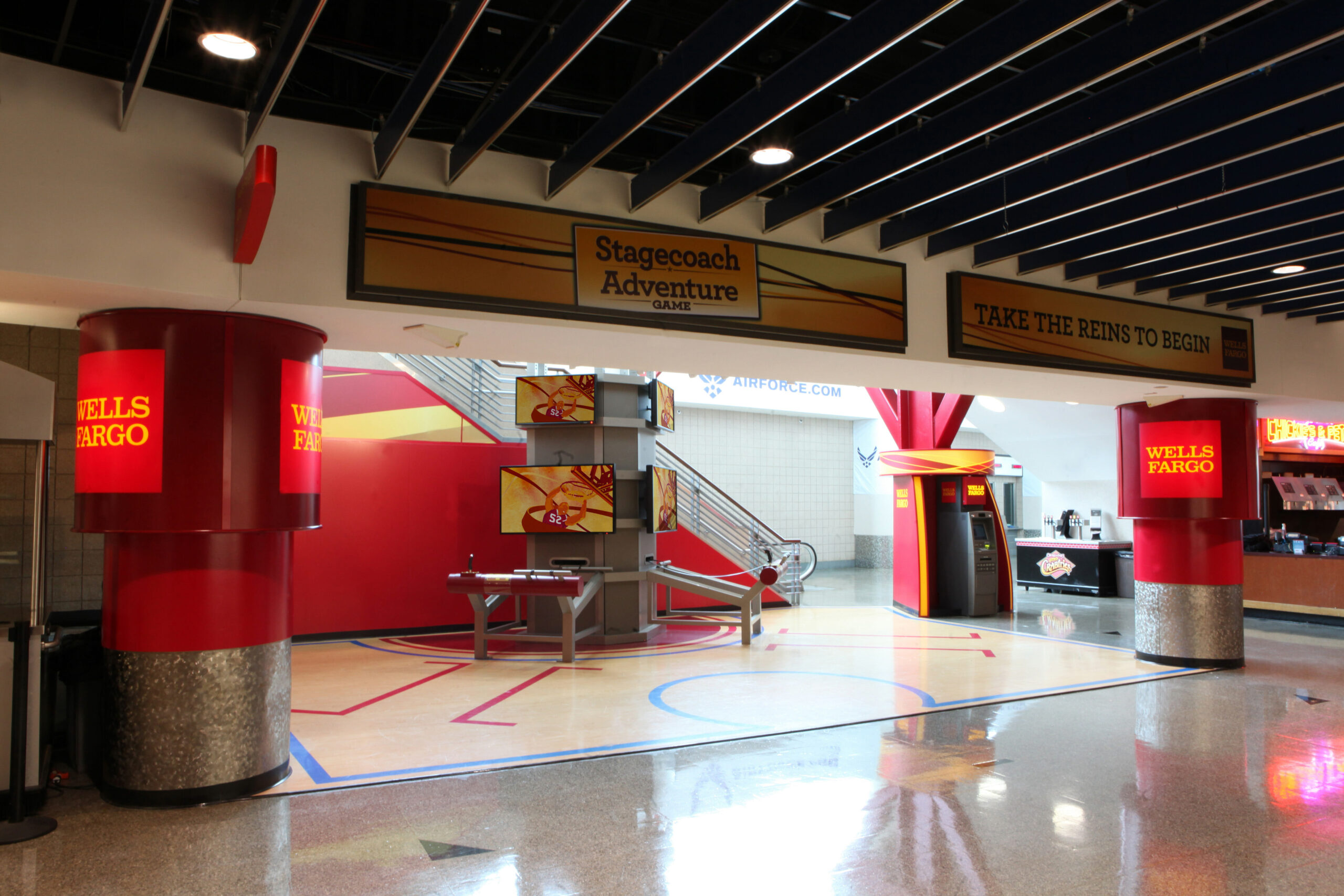 Wells Fargo: With naming rights to a stadium, Wells Fargo had an opportunity to create a concourse activation to promote, educate, and otherwise inspire current customers and potential new customers. The result was a very unique sports-themed space, complete with a two-story media tower used to highlight promotional content, live game feeds, and an opportunity to play the branded game Stagecoach Adventure.