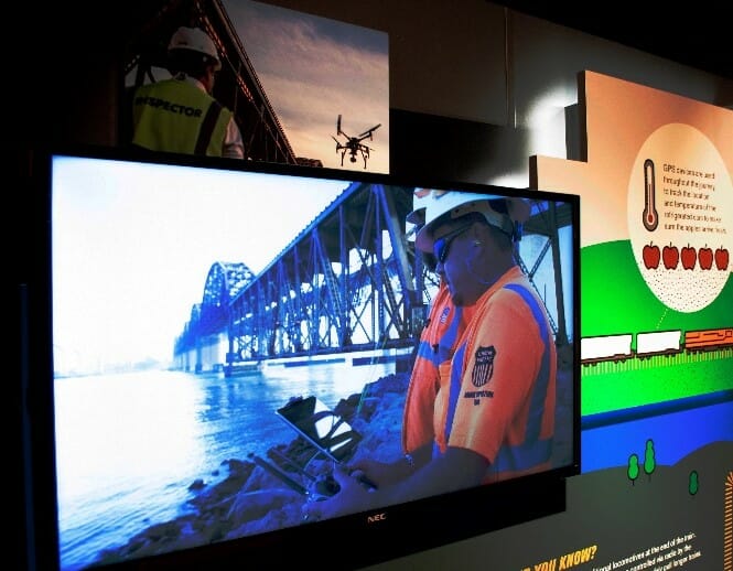Focused on the spirit and history of innovation at Union Pacific, the experience employs a combination of graphics, lighting, tactile and digital interative experiences to engage visitors with leading-edge Union Pacific technology and to help them understand the integrated role of the railroad in our everyday lives.